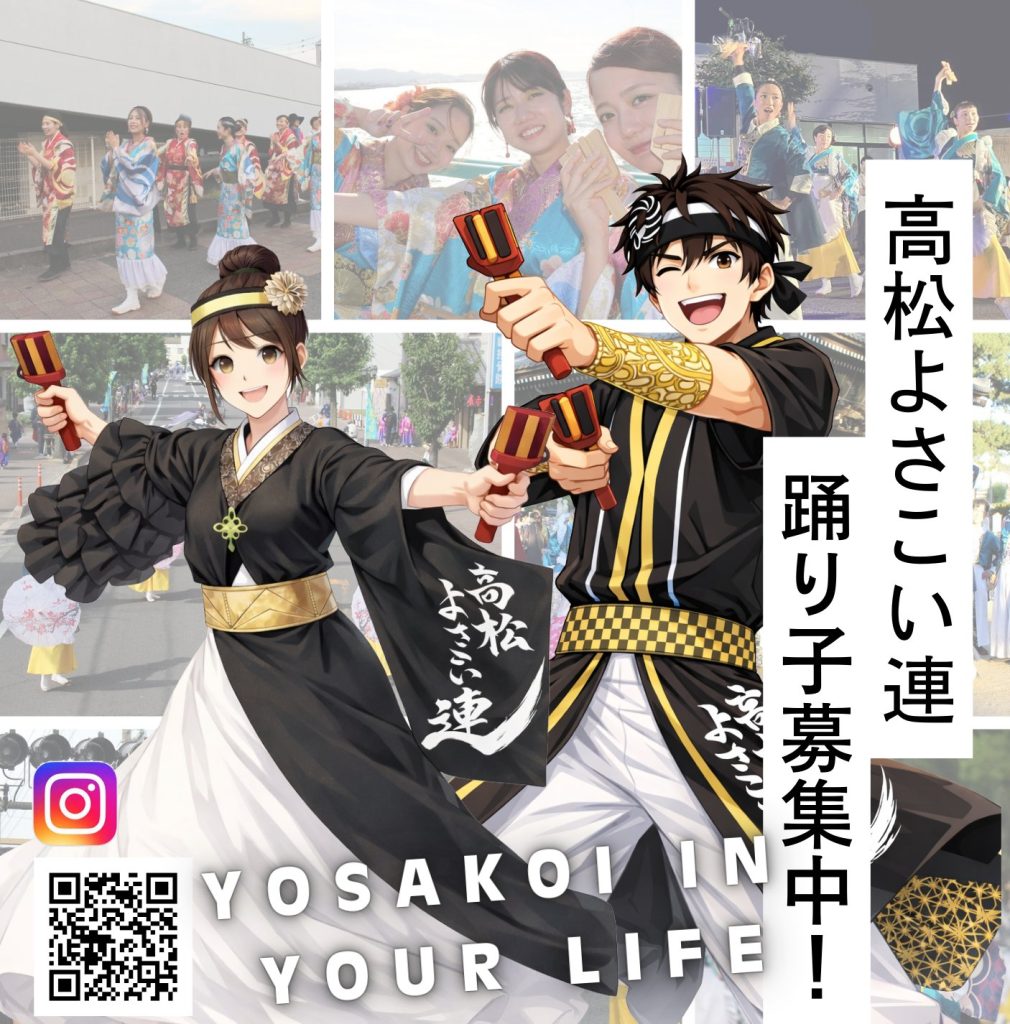 高松よさこい連は、2000年に結成された香川県東讃地区で初のよさこいチームです。高知よさこい祭りを始め、地元・さぬき高松祭りへの参加を中心に、県内外の祭りやイベント、ご依頼・ご招待いただいた場所等で踊らせていただいております。